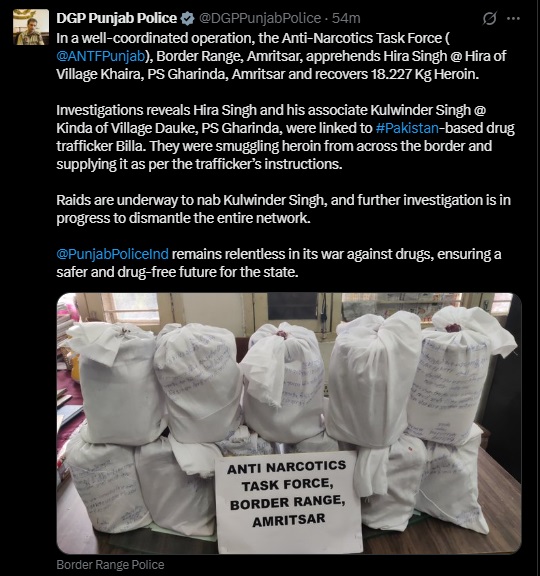 ਐਂਟੀ-ਨਾਰਕੋਟਿਕਸ ਟਾਸਕ ਫੋਰਸ, ਬਾਰਡਰ ਰੇਂਜ ਅੰਮ੍ਰਿਤਸਰ ਨੇ ਕਾਰਵਾਈ ਕਰਦਿਆਂ ਹੀਰਾ ਸਿੰਘ ਨੂੰ ਪਿੰਡ ਖਹਿਰਾ, ਥਾਣਾ ਘਰਿੰਡਾ, ਅੰਮ੍ਰਿਤਸਰ ਤੋਂ ਗ੍ਰਿਫਤਾਰ ਕਰਕੇ 18.227 ਕਿਲੋ ਹੈਰੋਇਨ ਬਰਾਮਦ ਕੀਤੀ ਹੈ। ਇਸ ਦੀ ਜਾਣਕਾਰੀ ਪੰਜਾਬ ਦੇ ਡੀ. ਜੀ. ਪੀ. ਗੌਰਵ ਯਾਦਵ ਨੇ ਟਵੀਟ ਕਰਕੇ ਸਾਂਝੀ ਕੀਤੀ ਹੈ।