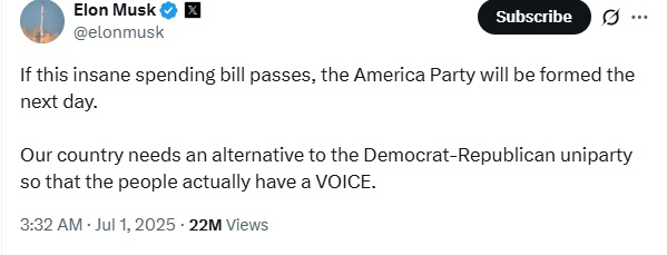 ਸ਼੍ਰੀ ਮਸਕ ਨੇ ਰਿਪਬਲਿਕਨ ਵਿਰੋਧੀ ਬਿਆਨਬਾਜ਼ੀ ਨੂੰ ਵਧਾ ਦਿੱਤਾ ਹੈ, ਬਿੱਲ ਦੇ ‘ਪਾਗਲਪਣ ਖਰਚ’ ਦੀ ਆਲੋਚਨਾ ਕੀਤੀ ਅਤੇ ਦਾਅਵਾ ਕੀਤਾ ਕਿ ਇਹ ਰਿਪਬਲਿਕਨ ਪਾਰਟੀ ਨੂੰ ਡੈਮੋਕ੍ਰੇਟ ਤੋਂ ਵੱਖ ਨਹੀਂ ਦਿਖਾਉਂਦਾ ਹੈ। ਸ਼੍ਰੀ ਮਸਕ ਨੇ ਐਕਸ ‘ਤੇ ਪੋਸਟ ਕੀਤਾ,”ਜੋ ਕੋਈ ਵੀ ਖਰਚ ਘੱਟ ਕਰਨ ਦੇ ਵਾਅਦੇ ‘ਤੇ ਮੁਹਿੰਮ ਚਲਾਉਂਦਾ ਹੈ ਪਰ ਇਤਿਹਾਸ ‘ਚ ਸਭ ਤੋਂ ਵੱਡੀ ਕਰਜ਼ ਹੱਦ ਵਾਧੇ ‘ਤੇ ਵੋਟ ਕਰਨਾ ਜਾਰੀ ਰੱਖਦਾ ਹੈ, ਉਸ ਦਾ ਚਿਹਰਾ ਅਗਲੇ ਸਾਲ ਪਹਿਲੀ ਚੋਣ ‘ਚ ਇਸ ਪੋਸਟਰ ‘ਤੇ ਦਿਖਾਈ ਦੇਵੇਗਾ ਅਤੇ ਅੱਗੇ ਚਿਤਾਵਨੀ ਦਿੱਤੀ ਕਿ ਇਹ ਪਾਗਲਪਣ ਵਾਲਾ ਖਰਚ ਬਿੱਲ ਪਾਸ ਹੋ ਜਾਂਦਾ ਹੈ ਤਾਂ ਅਗਲੇ ਦਿਨ ਅਮਰੀਕਾ ਪਾਰਟੀ ਦਾ ਗਠਨ ਕੀਤਾ ਜਾਵੇਗਾ। ਸਾਡੇ ਦੇਸ਼ ਨੂੰ ਡੈਮੋਕ੍ਰੇਟ-ਰਿਪਬਲਿਕਨ ਯੂਨੀਪਾਰਟੀ ਦੇ ਵਿਕਲਪ ਦੀ ਲੋੜ ਹੈ ਤਾਂ ਕਿ ਲੋਕਾਂ ਕੋਲ ਅਸਲ ‘ਚ ਇਕ ਆਵਾਜ਼ ਹੋਵੇ।”