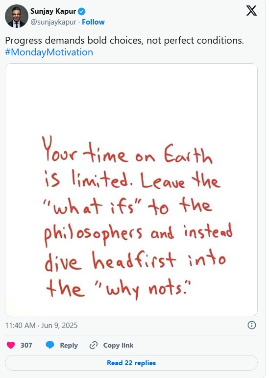 ਉਨ੍ਹਾਂ ਦੀ ਮੌਤ ਦੀ ਖ਼ਬਰ ਨੇ ਸੋਸ਼ਲ ਮੀਡੀਆ ‘ਤੇ ਹਲਚਲ ਮਚਾ ਦਿੱਤੀ ਹੈ ਖਾਸ ਕਰਕੇ ਉਨ੍ਹਾਂ ਦੀ ਇੱਕ ਪੋਸਟ ਨੇ ਲੋਕਾਂ ਨੂੰ ਭਾਵੁਕ ਕਰ ਦਿੱਤਾ ਹੈ। ਸੰਜੇ ਕਪੂਰ ਨੇ ਆਪਣੀ ਮੌਤ ਤੋਂ ਸਿਰਫ਼ ਤਿੰਨ ਦਿਨ ਪਹਿਲਾਂ ‘ਮੰਡੇ ਮੋਟੀਵੇਸ਼ਨ’ ਪੋਸਟ ਕੀਤੀ ਸੀ, ਜਿਸ ਵਿੱਚ ਉਨ੍ਹਾਂ ਨੇ ਲਿਖਿਆ ਸੀ-“ਤਰੱਕੀ ਲਈ ਦਲੇਰਾਨਾ ਚੋਣਾਂ ਦੀ ਲੋੜ ਹੁੰਦੀ ਹੈ, ਸੰਪੂਰਨ ਸਥਿਤੀਆਂ ਦੀ ਨਹੀਂ… ਇਸ ਧਰਤੀ ‘ਤੇ ਤੁਹਾਡਾ ਸਮਾਂ ਸੀਮਤ ਹੈ।” ਹੁਣ ਇਸ ਪੋਸਟ ਬਾਰੇ ਅੰਦਾਜ਼ੇ ਲਗਾਏ ਜਾ ਰਹੇ ਹਨ ਕਿ ਸ਼ਾਇਦ ਉਨ੍ਹਾਂ ਨੂੰ ਆਪਣੀ ਮੌਤ ਦੀ ਭਵਿੱਖਬਾਣੀ ਸੀ।